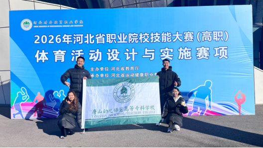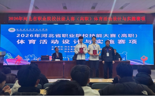 2025年12月18日至21日,在河北对外经贸职业学院举办的2026年河北省职业院校技能大赛高职组“体育活动设计与实施”赛项中,由我校公共教学部周庆波主任带队,23级体育教育1班高歌雅曼、甄文奇和24级体育教育3班张新婕、姜佳成四位同学组成的代表队再创佳绩,荣获团体一等奖。这是继2025年在该赛项中取得一等奖后,我校学子再次获此殊荣。