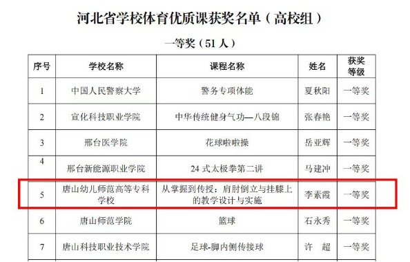 近日,河北省教育厅公布高等学校体育优质课评选结果。李素霞教师凭借精心的教学设计、生动的说课展示与富有创新的课堂实践,在评选中脱颖而出,荣获一等奖,充分展现了我校体育教师扎实的教学功底和立德树人的育人风采。
